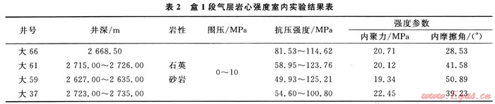 為了研究盒1段氣層欠平衡水平井在砂巖內(nèi)鉆進(jìn)時(shí)的井壁穩(wěn)定性問題,對(duì)盒1段氣層直井橫向取心后,進(jìn)行了巖石力學(xué)實(shí)驗(yàn)。