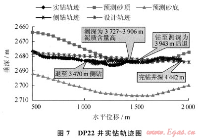 DP22井在水平段的氮?dú)馀菽菲胶忏@進(jìn)過(guò)程當(dāng)中實(shí)現(xiàn)了隨鉆點(diǎn)火,火焰高4~6m,后效火焰高9~11m,油氣顯示非?;钴S。DP22井在井深3727~3906m井段伽馬值偏高,判斷為鉆遇泥巖夾層,后退至3470m處進(jìn)行懸空下切側(cè)鉆,后鉆至井深4442m處完鉆,由于后退下切側(cè)鉆導(dǎo)致氮?dú)馀菽瓕?shí)鉆進(jìn)尺超過(guò)1900m。在最后一趟鉆起鉆過(guò)程中出現(xiàn)了卡鉆事故。事故原因?yàn)槌辽晨ㄣ@,最后一趟鉆總進(jìn)尺為281.54m,平均機(jī)械鉆速為11.04m/h,在鉆井過(guò)程中伽馬值偏高,同時(shí)出口處沒有巖屑返出。圖7給出了DP22井氮?dú)馀菽菲胶馑蕉螌?shí)鉆軌跡。