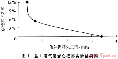 圖1給出了盒1段氣層巖心損害實(shí)驗(yàn)結(jié)果,從圖1中可以確定出盒1段氣層欠平衡水平井的最佳欠壓值為3.4MPa,即在盒1段氣層實(shí)施欠平衡水平井的循環(huán)介質(zhì)當(dāng)量循環(huán)密度需小于0.76g/cm3,滿足該條件的循環(huán)介質(zhì)只有氮?dú)夂偷獨(dú)馀菽?,但考慮到鉆井時(shí)產(chǎn)生的振動(dòng)影響、電磁隨鉆測(cè)量系統(tǒng)的可靠性要求以及鉆頭的冷卻問題,決定選用可循環(huán)氮?dú)馀菽鳛檠h(huán)介質(zhì),其當(dāng)量循環(huán)密度為0.2~0.5g/cm3,滿足了施工要求。