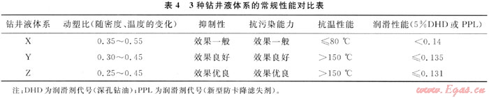 在綜合調(diào)研國內(nèi)外深井鉆井液體系的基礎(chǔ)上,結(jié)合川西地區(qū)深井的工程地質(zhì)特征及鉆井液的現(xiàn)場應(yīng)用情況,選擇在川西地區(qū)應(yīng)用比較成功的X、Y和Z等3種鉆井液體系進(jìn)行室內(nèi)評價,根據(jù)配方進(jìn)行配制的鉆井液,對其流變性、抑制性、潤滑性及抗溫、抗鹽膏能力進(jìn)行了系統(tǒng)的評價(表4)。結(jié)果表明,3種鉆井液體系具有各自的特點(diǎn)和適用范圍,X鉆井液屬于不分散鉆井液體系,對提高鉆井速度很有幫助,但是其在耐溫性和固相容量限兩個方面存在問題。當(dāng)?shù)貙訙囟瘸^80℃時,X鉆井液體系的性能開始惡化,穩(wěn)定性變差,失水量增加;而當(dāng)鉆井液密度過高時,由于受到X鉆井液容量限的限制,鉆井液性能會整體變差。因此,X鉆井液體系只適應(yīng)于淺井段的鉆井。