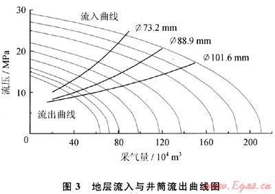 單井采注氣能力的大小,受地層滲流能力和井筒流動能力兩方面因素影響,只有當地層流入能力與井筒流出能力協調一致時,也即在流入流出曲線圖(圖3)中曲線交匯處氣井的生產能力才是最高的。