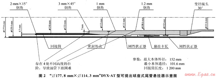 1) 水平井Φ114.3mm尾管懸掛器與Φ177.8mm套管(內(nèi)徑Φ159.42mm)座掛后,懸掛器回接筒(外徑Φ146mm)與Φ177.8mm套管內(nèi)壁之間的間隙為6.71mm,加上回接筒壁厚6.5mm,懸掛器端面與Φ177.8mm套管內(nèi)壁間有13.21mm高的臺階,除去回接筒端面2mm×15°倒角,兩者間最小也有11.21mm的臺階,不利于Φ93×2mm的油管喇叭口進(jìn)入回接筒內(nèi),導(dǎo)致油管下放困難(圖2)。