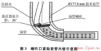 3) 目前尾管懸掛器座掛位置一般位于井斜30°左右處。因此,油管喇叭口在經(jīng)過該井段時(shí)其端面勢必緊貼套管內(nèi)壁,致使無法順利進(jìn)入懸掛器回接筒內(nèi)(圖3)。