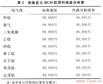 高純度起始組分(原料氣)中的雜質(zhì)分析是制備高準(zhǔn)確度RGM的另一個必須解決的關(guān)鍵技術(shù)。此類測定準(zhǔn)確度要求很高的原料氣純度分析研究工作不可能由生產(chǎn)廠家完成。根據(jù)GB/T 5274附錄A有關(guān)原料氣純度的論述表明,表2所示的原料氣純度數(shù)據(jù)在尚未作進(jìn)一步分析驗(yàn)證前,它們不能應(yīng)用于制備擴(kuò)展不確定度為0.5%(包括表中所列9個組分的)多元RGM的原料氣,甚至也不能應(yīng)用于制備擴(kuò)展不確定度為1%的多元RGM。