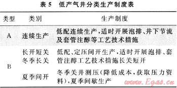 基于上述對低產(chǎn)井的精細分類,通過結(jié)合泡沫排水采氣、井下節(jié)流等配套工藝技術(shù)措施,制訂出了低產(chǎn)井的合理生產(chǎn)制度(表5),并逐漸形成了榆林南區(qū)低產(chǎn)井開發(fā)管理模式[4]。