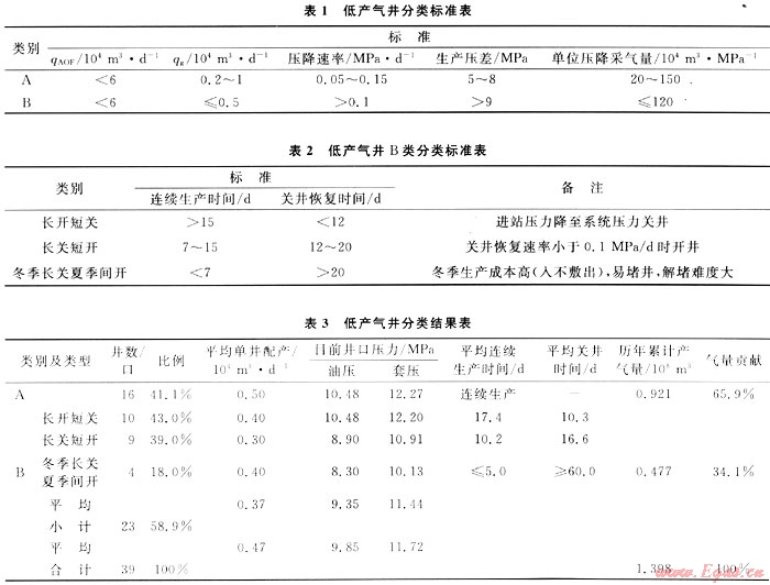 為了提高低產(chǎn)井的采氣時率和采收率,便于對氣井進行更好地開發(fā)與管理,依據(jù)氣井的儲層參數(shù),結(jié)合生產(chǎn)動態(tài)和穩(wěn)產(chǎn)能力,對低產(chǎn)井進行分類,實現(xiàn)低產(chǎn)井的精細管理(表1、2、3)。