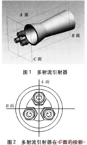 大氣式燃燒器中,引射器通常是1根引射管對應(yīng)1個噴嘴,這是目前最成熟、最常見的應(yīng)用形式。針對目前我國家用燃氣灶具熱效率低、燃燒不充分、煙氣排放量大、熱負荷小等問題,本文在家用燃氣灶領(lǐng)域創(chuàng)新地提出多射流交叉撞擊引射概念,其引射器的主要特征就是1根引射管對應(yīng)2個或者3個軸線相交的噴嘴,即1根引射管內(nèi)含有幾股交叉撞擊的燃氣氣流。