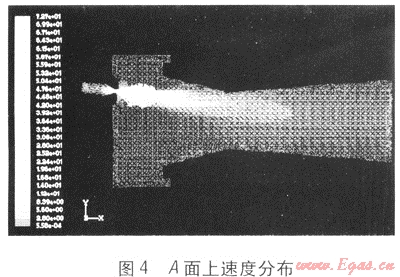 圖4為引射器A面上速度分布。燃氣以一定速度進入引射管,燃氣靠本身的能量吸入一次空氣,經(jīng)過喉部后,在擴壓管內(nèi)燃氣與空氣進行能量、動量交換,混合趨于均勻,速度趨于穩(wěn)定,兩者混合均勻后經(jīng)擴壓管流出。