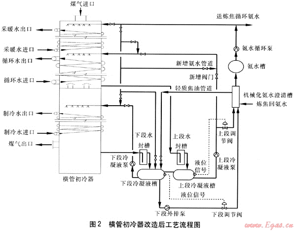 ① 在上段冷凝液泵總出口管道上增加一個閥門和循環(huán)氨水清掃管道。在冬季,將新增閥門關上,用循環(huán)氨水代替上段冷凝液對中段進行噴灑[3],中段的冷卻熱量由循環(huán)水通過涼水架換熱帶走,初冷器上、中段下來的冷凝液經(jīng)水封槽進入上段冷凝液槽,用上段冷凝液泵直接抽送到機械化氨水澄清槽,可以避免初冷器清掃下來的萘又重新進入初冷器中堵塞初冷器。在其他季節(jié),將新增閥門打開,用上段冷凝液直接對中段進行噴灑以降低煤氣溫度。
