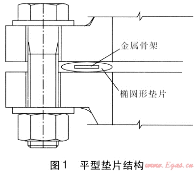 第1種結(jié)構(gòu)為平型墊片,其斷面幾何形狀為橢圓形,見圖1。當(dāng)用于天然氣管道時,平型墊片表面非金屬部分可以采用丁腈橡膠等橡膠材料,并且在其中嵌裝環(huán)形金屬骨架。金屬骨架的橫截面為長方形,嵌裝在橢圓形橡膠墊片的中心部位。推薦在0.4MPa設(shè)計壓力下使用這種結(jié)構(gòu)形式的墊片。