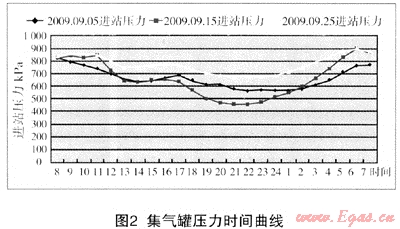 (2) 省公司對寶雞中燃實行均衡供氣。寶雞中燃用球罐進行日調(diào)峰,大多都是晚上進氣,白天出氣模式。匯一集氣罐上2009.09.05,2009.09.15,2009.09.25三天時間壓力曲線如圖2,基本上反映出匯一集氣罐壓力時間曲線。