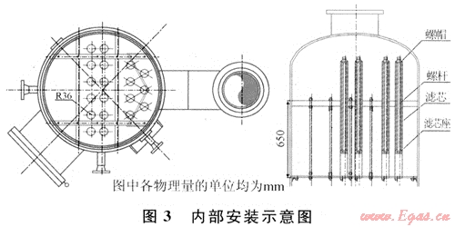 通過項(xiàng)目調(diào)研評(píng)估和可行性分析,決定拆除滌氣罐內(nèi)除沫網(wǎng),改裝19根高效過濾精度在0.05μm的頗爾纖維濾芯,方案經(jīng)過數(shù)次討論優(yōu)化,確定全部預(yù)制好到現(xiàn)場(chǎng)安裝,具體設(shè)計(jì)方案如圖2~4。