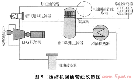 在運(yùn)行過程中取樣檢查時(shí)發(fā)現(xiàn)出口凝聚過濾器原設(shè)計(jì)的回油管線有大量的液體返回到壓縮機(jī)進(jìn)口,取樣分析內(nèi)含輕質(zhì)油、水和潤(rùn)滑油,其中輕質(zhì)油占80%,水占15%,滑油占5%。關(guān)閉回油管線10min后取樣回收液量1200mL,按此計(jì)算一個(gè)月累計(jì)有510L,如此多液體返回系統(tǒng)循環(huán),增加了二次污染。針對(duì)此情況,果斷地將回油管線進(jìn)行流程改造,將管線引入常溫分離器,利用兩端壓力差排液,同時(shí)利用常溫分離器的功能進(jìn)行油氣水分離。改造如圖5所示。