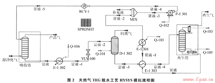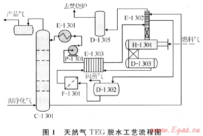 吸收塔C-1301底部排出的富TEG溶液經(jīng)TEG再生器H-1301頂部盤管E-1302與再生氣換熱升溫后進(jìn)入閃蒸罐D(zhuǎn)-1302閃蒸,閃蒸后的富TEG液經(jīng)過濾器F-1301除去雜質(zhì)后,進(jìn)入貧/富液換熱器E-1303與再生后的高溫貧TEG溶液進(jìn)行換熱,換熱升溫后進(jìn)入TEG再生器H-1301再生。從再生器緩沖罐D(zhuǎn)-1303流出的高溫貧TEG溶液,經(jīng)貧/富液換熱器E-1303換熱降溫后由TEG循環(huán)泵P-1301升壓至貧液冷卻器E-1301進(jìn)一步冷卻,滿足脫水工藝要求的TEG貧液送至吸收塔C-1301頂部。