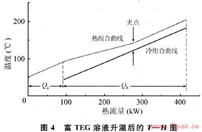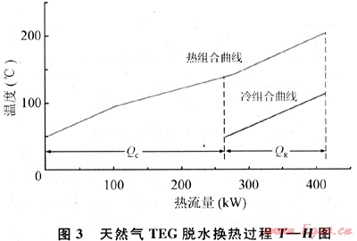設(shè)定最小允許傳熱溫差△Tmin=20℃,圖3為天然氣TEG脫水工藝流程換熱過程溫焓(T-H)圖。
