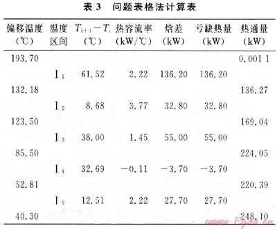 表3為應(yīng)用問題表格法計算換熱網(wǎng)絡(luò)所需公用工程量和夾點位置。換熱網(wǎng)絡(luò)的夾點位于193.70℃,加熱量為0kW,冷卻量為248.10kW。