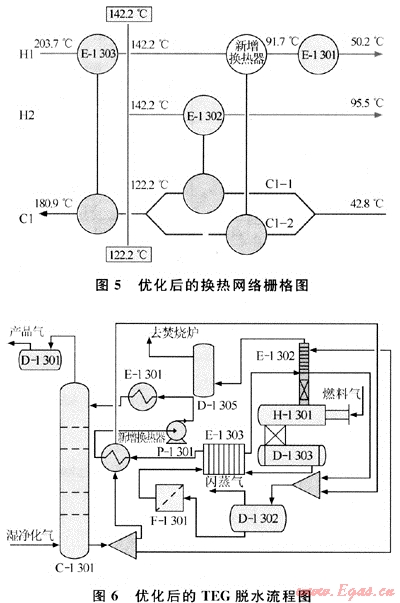 根據(jù)夾點設(shè)計規(guī)則[5],構(gòu)建最大能量回收換熱網(wǎng)絡(luò)(MER),將C1物流按熱容流率分成0.92kW/℃(C1-1)和1.41kW/℃(C1-2)兩股物流,C1-1物流通過換熱器E-1302與再生氣(H2)換熱到122.20℃,C1-2物流通過新增換熱器與貧TEG溶液(H1)換熱到122.20℃,然后兩股物流合并成一股通過換熱器E-1303與貧TEG溶液(H1)換熱到180.90℃,貧TEG溶液(H1)剩余熱量通過冷卻器E-1301將其溫度從91.7℃降到50.2℃。圖5、6為優(yōu)化后的換熱網(wǎng)絡(luò)柵格圖和工藝流程圖。