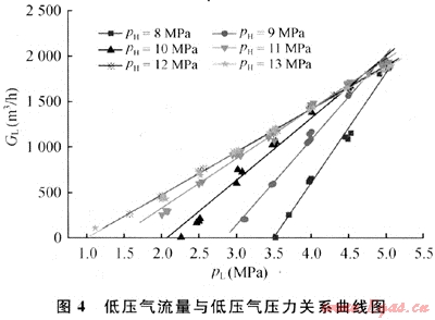 從圖3中可以看出,低壓氣流量與高壓氣壓力為非單調(diào)關(guān)系,隨高壓氣壓力的增大而先增大后減小。由該圖可知,當(dāng)高壓氣壓力(pH)為11~12MPa時,低壓氣流量的變化規(guī)律發(fā)生轉(zhuǎn)變,這與裝置設(shè)計工作壓力有關(guān)。