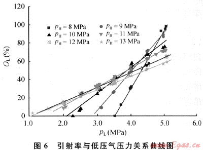 2) 低壓氣流量與高壓氣壓力非單調(diào)關(guān)系,隨著高壓氣壓力增加,低壓氣流量先增加后減小?,F(xiàn)場應(yīng)用并不是高壓井進(jìn)氣壓力越高越好,需要選擇合適的高壓氣工作壓力。