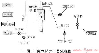 氮?dú)忏@井工藝技術(shù)流程是以氮?dú)鉃楣ぷ鹘橘|(zhì),使用空壓機(jī)對(duì)空氣先進(jìn)行輸氣,經(jīng)過制氮設(shè)備產(chǎn)生氮?dú)?,然后?jīng)過增壓機(jī)再增壓入井,最后完成攜帶巖屑和消除粉塵的任務(wù),具體流程見圖1。
