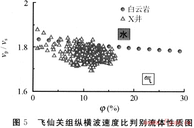對以孔隙為主的白云巖或石灰?guī)r儲層來說,如果縱橫波速度比值落在白云巖或石灰?guī)r線以下,解釋為氣;反之,解釋為水。飛仙關(guān)組和長興組經(jīng)過巖性校正后縱橫波速度比與孔隙度的交會點主要分布于白云巖線以下方,表明流體類型為氣層(圖5),與該段測試產(chǎn)氣相符合。