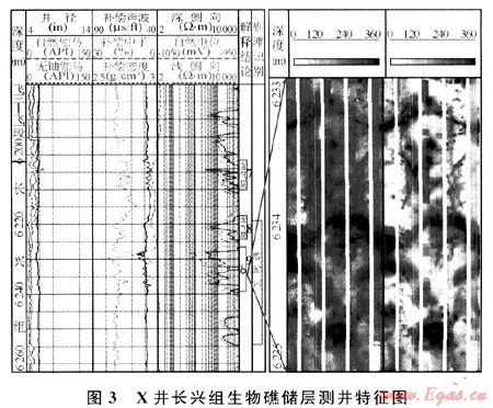 根據(jù)成像測井解釋結(jié)果,X井長興組生物礁儲層特點是孔洞的大小和分布具有更強的非均值性,洞徑比飛仙關(guān)組儲層大;裂縫相對飛仙關(guān)儲層發(fā)育,成像測井處理有效裂縫密度為2.47條/m,沿裂縫具有較強的溶蝕作用,對產(chǎn)能的貢獻大;儲層孔隙度較飛仙關(guān)組的低,平均孔隙度4.78%。儲層類型為裂縫-孔隙型。生物礁儲層巖性為白云巖和灰質(zhì)云巖或白云質(zhì)灰?guī)r。儲層的測井特征為低自然伽馬、中低電阻率和低密度,高聲波時差和較高補償中子孔隙度,井徑有輕度縮徑現(xiàn)象(圖3)。