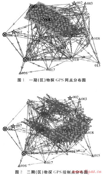 基于以上諸多因素,提出了“首級控制、分期(區(qū))布網(wǎng),首分網(wǎng)整體平差”的施工原則。即:首先在整個(gè)工區(qū)建立GPS骨架網(wǎng),根據(jù)施工順序在骨架網(wǎng)基礎(chǔ)上分兩期(區(qū))進(jìn)行GPS控制點(diǎn)加密;兩期(區(qū))加密GPS網(wǎng)分別連接骨架網(wǎng)的布測數(shù)據(jù)進(jìn)行平差處理。這樣既能及時(shí)提供施工所需的物探控制點(diǎn),又能保證整個(gè)網(wǎng)點(diǎn)精度的一致性。