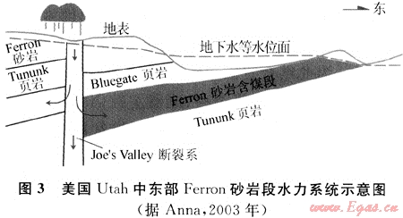 開放性斷層邊界有兩種情形:位于地下水補(bǔ)給區(qū)的開放性斷層和位于地下水排泄區(qū)的開放性斷層。地下水沿位于補(bǔ)給區(qū)的開放性斷層帶補(bǔ)給,分別向斷層兩側(cè)的煤層與含水層運(yùn)移,對煤層氣的散失起到阻止作用,同時(shí)斷層兩側(cè)的含水層和煤層為不同的流體流動(dòng)單元。因此起到分割不同煤層氣藏的作用。這類斷層邊界有利于煤層氣的保存。而地下水沿位于排泄區(qū)的開放性斷層排泄,造成煤層氣的散失。典型實(shí)例見圖3[4]。