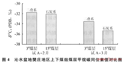 徑流水區(qū)地下水對煤層氣破壞的現(xiàn)象除了使含氣量降低以外,主要表現(xiàn)在流動(dòng)的地下水可使煤層甲烷碳同位素變輕,變輕的程度受水動(dòng)力強(qiáng)度影響。在我國的華北地區(qū),下部太原組煤系直接覆蓋在奧陶系灰?guī)r之上,煤系與下伏奧陶系石灰?guī)r巖溶裂隙含水層強(qiáng)徑流帶容易產(chǎn)生水力聯(lián)系,所以太原組下主煤層的煤系水動(dòng)力條件往往強(qiáng)于山西組上主煤層煤系。在煤層甲烷碳同位素值方面,下煤組煤層甲烷碳同位素輕于上煤組的現(xiàn)象十分普遍。例如鄂爾多斯盆地吳堡地區(qū),上煤組的3#煤層中的甲烷碳同位素值為-38.25‰,下煤組的10#煤層的甲烷碳同位素值為-46.26‰;沁水盆地試A-2井3#煤層和15#煤層甲烷碳同位素值分別為-31.8‰和-32.1‰;試A-3井甲烷碳同位素值分別為-33.56‰和-35.39‰(圖4)。