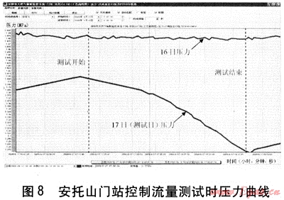 目前兩座門站沒(méi)有設(shè)置限流裝置,上游也沒(méi)有對(duì)門站采取限流。當(dāng)出站壓力保證穩(wěn)定,不采取降壓以利用次高壓管道的管道儲(chǔ)氣的情況下,在用氣高峰時(shí)段,流量超過(guò)合同規(guī)定的最大提取速率,超過(guò)最大提取速率提取的氣量將按正常價(jià)格的150%計(jì)價(jià)。針對(duì)以上實(shí)際情況,將壓力遙調(diào)的功能進(jìn)行拓展,通過(guò)在高峰時(shí)段降低出口壓力,減小調(diào)壓器開(kāi)度,從而間接地降低流量。在高峰時(shí)段需頻繁降壓,將流量控制在上游要求的最大提氣速率的95%以內(nèi),用戶需求的不足部分通過(guò)降低管道壓力、利用管道儲(chǔ)氣來(lái)補(bǔ)充。低峰時(shí)升高壓力來(lái)補(bǔ)充管道儲(chǔ)氣。這種頻繁的調(diào)整,在沒(méi)有遙調(diào)系統(tǒng)的情況下是很難實(shí)現(xiàn)的。圖7、8為改造后安托山門站晚高峰控制流量測(cè)試時(shí)的流量、壓力曲線。