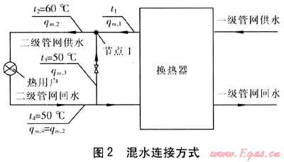 ① 板式換熱器是一種傳熱系數(shù)高、結(jié)構(gòu)緊湊、適應(yīng)性強(qiáng)、拆洗較方便、節(jié)省材料的換熱器。在地板輻射供暖系統(tǒng)中,若采用傳統(tǒng)選型方法,反而需要加大換熱器面積以降低二級側(cè)的阻力,這無疑是浪費(fèi)。熱用戶與二級管網(wǎng)采用混水連接形式既可發(fā)揮板式換熱器高換熱效率的優(yōu)勢,又可降低換熱器二級側(cè)阻力,實(shí)現(xiàn)優(yōu)化設(shè)計(jì)。