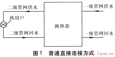 某居民住宅小區(qū),一級管網(wǎng)設(shè)計(jì)供回水溫度為130、70℃,設(shè)計(jì)供熱面積為5×104m2,設(shè)計(jì)供暖熱指標(biāo)取64W/m2,計(jì)算得出設(shè)計(jì)熱負(fù)荷為3200kW。采用地板輻射供暖系統(tǒng),設(shè)計(jì)供回水溫度為60、50℃。當(dāng)熱用戶與二級管網(wǎng)采用普通的直接連接方式(見圖1)時,采用某換熱器計(jì)算選型軟件進(jìn)行選型計(jì)算。在分別僅滿足換熱量要求時、滿足二級側(cè)阻力要求時,換熱器選型計(jì)算結(jié)果見表1。換熱量安全系數(shù)取1.3,經(jīng)計(jì)算得到,總換熱量為4160kW,對數(shù)平均溫差為39℃。由表1可知,當(dāng)僅滿足換熱量要求時,換熱面積余量為7.5%;滿足二級側(cè)阻力要求時,換熱面積余量為135.7%。