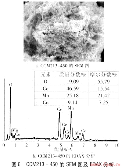 圖6為樣品CCM213-450的SEM圖及EDAX分析。由圖6a可見,催化劑表面呈現(xiàn)蜂窩狀多孔結(jié)構(gòu),這種結(jié)構(gòu)的物質(zhì)可以有很大的比表面積及孔隙率。該多孔結(jié)構(gòu)增加了樣品的比表面積,也有利于催化反應(yīng)中吸附及氧化過程的進(jìn)行。但由圖6a可見,表面孔徑分布不均,可能與焙燒過程中升溫速率過快有關(guān)。圖6b為樣品的EDAX分析,Ce、Co、Mn、O這4種元素的物質(zhì)的量比基本滿足了2:1:3:7.5的關(guān)系。