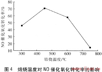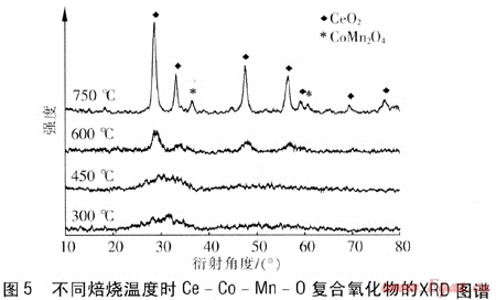 analyses of the samples show that when the calcinations temperature is equal to or less than 450℃.the catalyst has an amorphous state,a large number of pore channels and a large specific surface area. The crystalline phase separation occurs at 600℃.and the spinel phase occurs on the catalysts surface at 750℃,which leads to a drastic reduction of the activity.