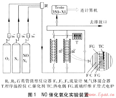 目前,NOx的主要來源為電廠、供熱鍋爐煙氣及汽車尾氣,且90%~95%為NO[1、2]。應(yīng)用于NOx脫除的各類方法包括:選擇性催化還原法(SCR)、連續(xù)再生捕集(CRT)、NOx儲存與還原(NSR)及濕法脫硝等,這些方法的共同點(diǎn)為在NOx脫除時NO2比NO具有更高的活性[3~5]。因此,如能將NO選擇性催化氧化為NO2,對于各類脫氮方法都將是一項重要的貢獻(xiàn)。根據(jù)NO與O2的化學(xué)反應(yīng)方程及反應(yīng)機(jī)理[6]可知,該反應(yīng)在熱力學(xué)上是可行的,但在常溫下,由于NO的弱極性及化學(xué)性質(zhì)的穩(wěn)定性,它們的反應(yīng)速度非常緩慢。NO選擇性催化氧化過程是指在催化劑及一定的反應(yīng)溫度下,將NO催化氧化為NO2,然后根據(jù)不同的脫除方法選擇不同的操作方式。如濕法脫硝過程,當(dāng)氧化度提高到50%~60%時,液相吸收劑(如腐植酸鈉、氨水及Na2CO3)對NOx將取得最佳吸收效率[2]。