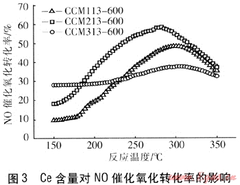 針對NO催化氧化的重要性,國內(nèi)外學(xué)者開展了積極的研究,其中以貴金屬Pt、Pd催化劑的轉(zhuǎn)化效率較高,300℃時轉(zhuǎn)化率接近90%[7~9]。我國貴金屬資源相對匱乏且造價高昂,主要用于汽車尾氣處理,而大型煙氣處理裝置則難以實(shí)現(xiàn)。近年來,以過渡金屬為活性主體的新型催化劑引起了國內(nèi)外學(xué)者的重視,并進(jìn)行了大量研究[10~12]。我國的稀土儲量位居世界第一,將各類稀土元素應(yīng)用于催化領(lǐng)域已有大量報道,其中以La、Ce應(yīng)用較多。以CeO2為例,由于其強(qiáng)大的儲存和釋放氧的能力,已被應(yīng)用到多個催化方向(如CO催化氧化)[13]。