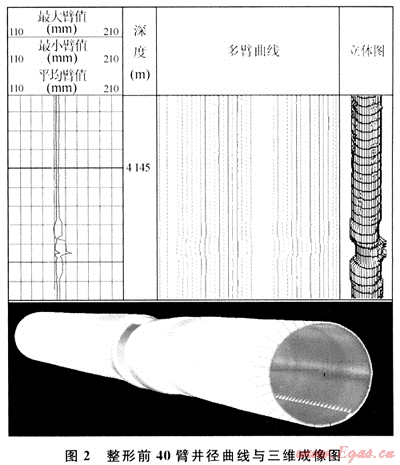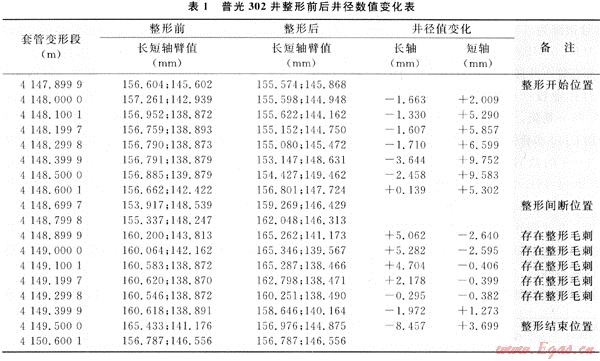 為了檢驗整形效果和了解整形后套管回彈情況,整形24h后用40臂井徑測井儀器復(fù)測,整形段套管內(nèi)徑變化對比見表1。從表1中可以看出,套管變形嚴(yán)重井段4148.0~4148.6m的長軸徑值縮短1.3~3.6mm;短軸徑值增加2~9.7mm,具有較明顯的整形效果;井段4148.9~4149.3m整形效果不理想,該處為套管接箍,分析存在套管整形毛刺。