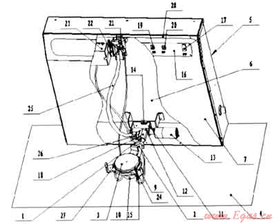 圖中所示:1、噴嘴,2、引射管,3、爐頭,4、櫥柜臺面或桌面,5、灶具主殼體,6、后殼面,7、前殼面,8、孔,9、鍋架,10、爐頭支撐架,11、轉(zhuǎn)軸固定架,12、轉(zhuǎn)軸,13、電動機,14、上限位開關(guān),15、下限位開關(guān),16、控制電路板,17、電源輸入控制開關(guān),18、連接件,19、上升開關(guān),20、下降開關(guān),21、旋塞閥,22、旋鈕,23、脈;中點火器,24、點火針,25、分氣管,26、分氣管接頭,27、熱電偶式熄火保護裝置,28、進(jìn)氣管。