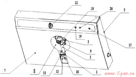 如圖2所示,本研究項目在不使用時其燃燒機構(gòu)是放置在灶具主殼體5內(nèi)的;當(dāng)用戶打開電源輸入控制開關(guān)17使本研究項目通電后,用戶只要按動下降開關(guān)20,轉(zhuǎn)軸12就會從上而下旋轉(zhuǎn),當(dāng)下限位開關(guān)15碰到臺面或桌面4時,轉(zhuǎn)軸12停止旋轉(zhuǎn),此時的燃燒機構(gòu)已經(jīng)在轉(zhuǎn)軸12的帶動下平放在櫥柜臺面或桌面4上了,如圖1所示;當(dāng)用戶按動上升開關(guān)19時,燃燒機構(gòu)就會在轉(zhuǎn)軸12的帶動下由下往上旋轉(zhuǎn),當(dāng)燃燒機構(gòu)回縮到灶具主殼體5內(nèi)時其后端會碰到上限位開關(guān)14,此時轉(zhuǎn)軸12就停止旋轉(zhuǎn),而此時的燃燒機構(gòu)也回復(fù)到未使用時的狀態(tài)。