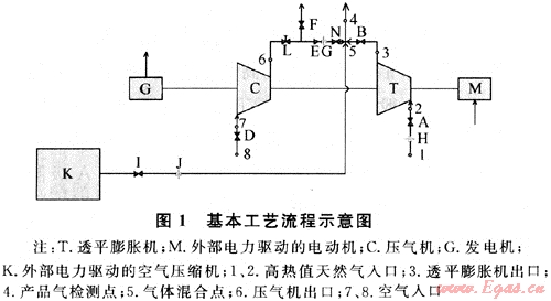 蘊(yùn)含有大量壓力能的高壓天然氣,大多數(shù)情況下需要在調(diào)壓站通過調(diào)壓設(shè)備進(jìn)行降壓處理。采用這種傳統(tǒng)的調(diào)壓方式,天然氣自身蘊(yùn)含的壓力能在調(diào)壓設(shè)備降壓過程中被白白損失掉了,而且降壓過程還產(chǎn)生大量的噪音;另外,由于設(shè)備急劇降溫,還將有可能對(duì)調(diào)壓及管道設(shè)備運(yùn)行造成威脅甚至損害。同時(shí),這種傳統(tǒng)調(diào)壓方式并不能調(diào)配調(diào)壓站出站天然氣的熱值和燃燒特性參數(shù),各個(gè)調(diào)壓站的出站天然氣熱值不一致,燃燒特性參數(shù)也難以完全滿足管網(wǎng)要求。因此,需要實(shí)施一種新技術(shù),能夠確保各個(gè)調(diào)壓站出站天然氣的熱值和燃燒特性滿足用戶需求。