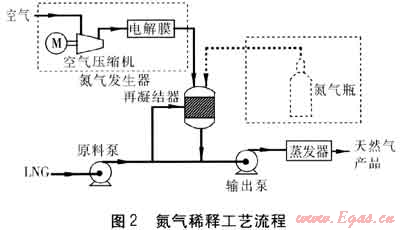 利用氮?dú)庀♂屖钦{(diào)節(jié)熱值的重要手段,也是傳統(tǒng)的重?zé)N去除工藝之一,氮?dú)庀♂尮に嚵鞒桃妶D2。原料LNG經(jīng)原料泵增壓后進(jìn)入再凝結(jié)器,在再凝結(jié)器中與氮?dú)?從空氣中提純或取自氮?dú)馄?混合,再經(jīng)輸出泵增壓,經(jīng)蒸發(fā)器輸出。氮?dú)庀♂尮に囍械妮敵霰脡嚎s過程為液體壓縮,相比蒸餾塔分離工藝中的氣體壓縮,可以節(jié)省大量的電能,但是增加了昂貴的氮?dú)獍l(fā)生器或氮?dú)夤?yīng)系統(tǒng)。此外,如果氮?dú)獾臏囟炔粔虻?,LNG與N2的混合過程和液體壓縮過程中將會產(chǎn)生大量的熵增。