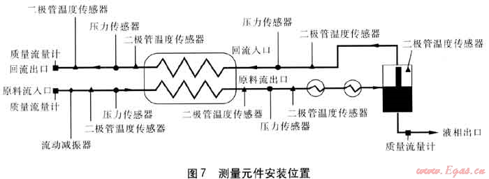 d. 測量及數(shù)據(jù)采集系統(tǒng)。溫度、壓力、流量測量元件安裝位置見圖7。測量數(shù)據(jù)均通過數(shù)據(jù)線上傳至計(jì)算機(jī),采用LABVIEW 8.2軟件進(jìn)行采集、記錄。