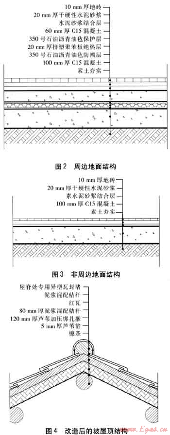 由調(diào)研可知,有82.5%的農(nóng)村住宅采用坡屋頂,其結(jié)構(gòu)便于設(shè)置絕熱層。筆者建議農(nóng)村住宅仍采用坡屋頂,改造后的坡屋頂結(jié)構(gòu)見圖4。為了提高屋頂絕熱性能,一方面,根據(jù)蘆葦?shù)某休d力,可適當(dāng)加厚泥漿混配秸稈的厚度至80mm,并調(diào)整秸稈與泥漿的質(zhì)量比至1:50。另一方面,將蘆葦加壓綁扎成捆,厚度增加到120mm,葦捆下敷設(shè)5mm厚蘆葦箔,這樣既可絕熱防水,又可以顯著降低屋頂?shù)膫鳠嵯禂?shù)。經(jīng)計算,改造后的屋頂傳熱系數(shù)為0.34W/(m2·K),小于DB 29—1—2010規(guī)定的限值0.35W/(m2·K)。
