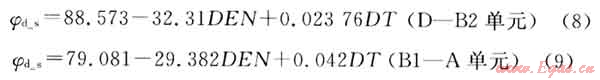 該氣田陵三段巖心孔隙度隨巖石顆粒密度變化明顯,這正是儲層微觀非均質性的表現(xiàn)。因此常規(guī)簡單孔隙度計算模型,如密度孔隙度采用砂巖密度2.65g/cm3這一固定值計算誤差勢必較大,為此孔隙度評價需要建立在對于不同流動單元儲層特性的基礎之上,進行類別劃分,才能確定準確的孔隙度評價模型。通過研究,將陵三段6個流動單元大致分為2類,選取與巖心孔隙度關系較好的密度、聲波時差曲線作為建模曲線,最終確定基于流動單元的孔隙度評價模型為: