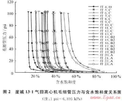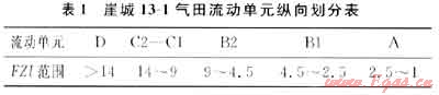 崖城13-1氣田評價的早期,采用傳統(tǒng)的一套氣藏統(tǒng)一測井處理參數(shù)的方法,沒有過多考慮氣藏縱向上測井巖石物理特性的變化,后來嘗試分巖相建立測井解釋模型,但是采用常規(guī)測井資料劃分出的巖相較粗,而井點巖相變化較復雜,按照巖相建立確定性模型比較困難,而且誤差較大,可能出現(xiàn)氣田動、靜態(tài)儲量評價的較大差異;認識到這些問題后,研究人員開始轉向將這一整裝氣田按流動單元的思想來進行精細剖析。按照前述方法,對于陵三段儲層,通過研究巖石孔隙結構特征,按照孔隙類型、孔喉分布以及表征巖石孔隙結構的流動帶指標FZI劃分了6個流動單元,而其中有些流動單元只存在壓力差異而與測井評價相關的巖石