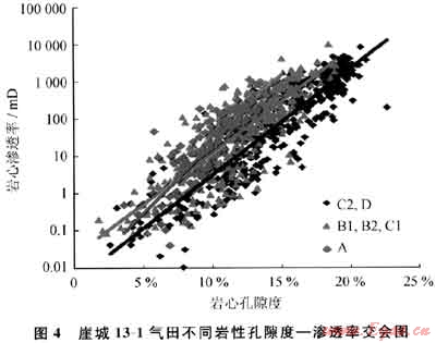 筆者探索了幾種辦法,以減少孔滲關系圖上點子的分散性。首先,也是最明顯的,就是看巖相對點子的分散性造成了多大的影響,于是,按照巖心地質描述得到的巖相作了孔滲關系圖,發(fā)現(xiàn)每一類數(shù)據(jù)點的分布與其他都不相同,但又有許多重疊部分。因此,即使我們可以從測井曲線中得到巖相的信息,這種方法依然不能精確地用孔隙度來確定滲透率值。