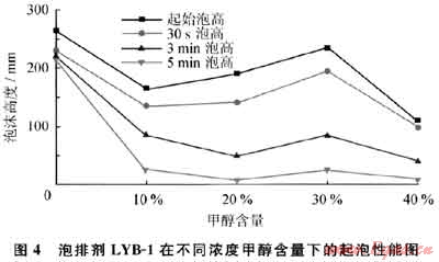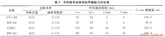 為了充分說(shuō)明泡排劑LYB-1具有較強(qiáng)的抗甲醇能力,30℃時(shí)將該泡排劑與現(xiàn)場(chǎng)應(yīng)用較多的泡排劑UT-118、HY-5G和HY-3G進(jìn)行了對(duì)比,試驗(yàn)結(jié)果見(jiàn)表3。表3數(shù)據(jù)表明,泡排劑LYB-1具有較強(qiáng)的抗甲醇能力,明顯優(yōu)于其他3種泡排劑。