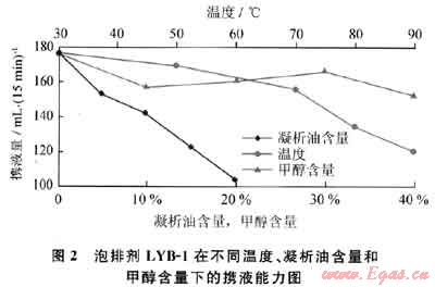 通常溫度升高,泡排劑溶液的黏度降低,泡沫易破裂,致使泡沫起泡能力和攜液能力變差。為了評(píng)價(jià)該泡排劑的耐溫能力,用地層水配制0.5%泡排劑溶液,測(cè)定了該泡排劑在不同溫度下的起泡能力和攜液能力(圖1)。
