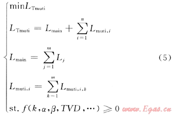 根據(jù)不同的主井眼類型選用不同的井深計(jì)算方法和限制條件[9],聯(lián)合不同的分支井眼井深計(jì)算和限制條件就可以組合為分支水平井軌道優(yōu)化的數(shù)學(xué)模型,由此能夠建立出目標(biāo)函數(shù)[10]——使得整個(gè)軌道長(zhǎng)度為最小。分支水平井設(shè)計(jì)優(yōu)化模型為: