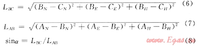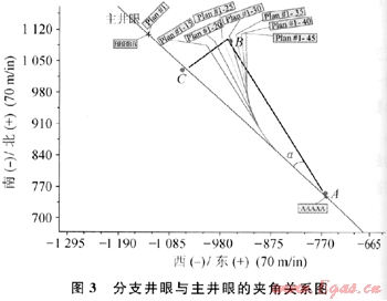 式中AN、AE、AH、BN、BE、BH、CN、CE、CH分別表示A、B、C點(diǎn)在三維空間坐標(biāo)系內(nèi)的坐標(biāo);LBC表示B點(diǎn)到C點(diǎn)的長(zhǎng)度;L徹表示A點(diǎn)到8點(diǎn)的長(zhǎng)度;a表示分支井眼的側(cè)鉆點(diǎn)與分支井眼終點(diǎn)的連線與主井眼的直線夾角。
